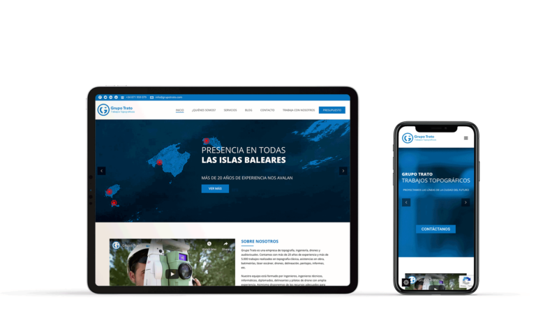 Grupo Trato es una empresa de topografía, ingeniería, drones y audiovisuales, con presencia en todas las Baleares. La empresa cuenta con más de 20 años de experiencia y más de 5.000 trabajos realizados en topografía clásica, asistencias en obra, batimetrías, láser escáner, drones, delineación, peritajes, informes, etc. Acudieron a Digitalent con el objetivo de llevar a cabo una página web corporativa en la que exponer sus servicios y mejorar su posicionamiento en internet.