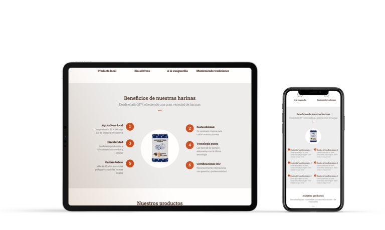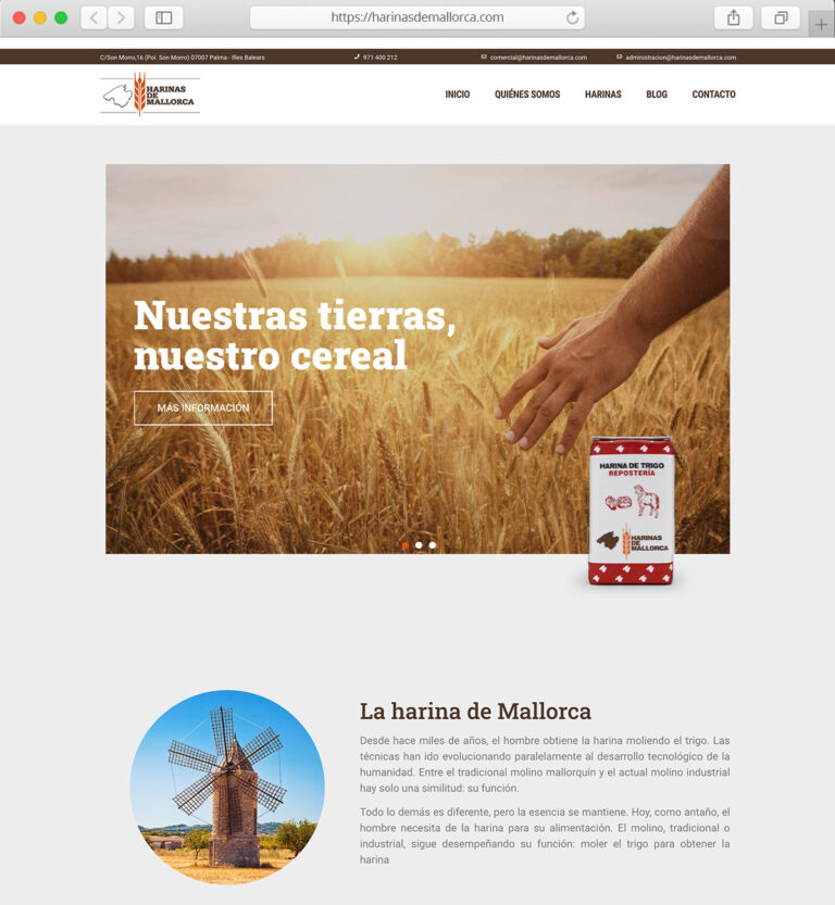 Una de las acciones que han querido realizar es una página web corporativa para que Harinas de Mallorca tenga presencia online. Es una web corporativa donde se puede consultar el amplio catálogo de productos de la marca y conocer su historia. Además, tienen el objetivo de crear contenido de interés como recetas y noticias.